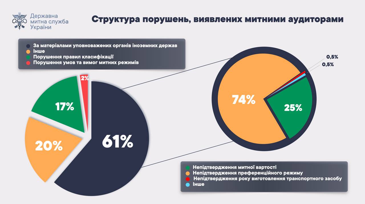 ⁃ за матеріалами уповноважених органів іноземних держав (непітвердження преференційного режиму, митної вартості, року виготовлення транспортних засобів тощо) – 61%,