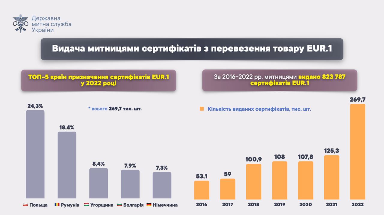 У 2016 році митницями Держмитслужби було видано 53,1 тис. сертифікатів EUR.1. Протягом 2022 року кількість виданих сертифікатів склала 269,7 тис., що в 5 разів більше кількості виданих сертифікатів у 2016 році.