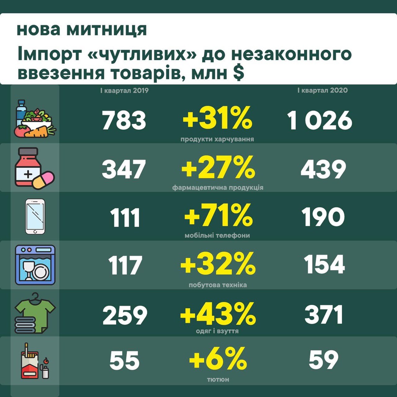 Імпорт «чутливих» до незаконного ввезення споживчих товарів у І кварталі 2020 року зріс на 24,5% — з 2,7 млрд дол. до 3,35 млрд дол. Такі споживчі товари — харчі, фармацевтична продукція, мобільні телефони, побутова техніка, меблі, одяг та взуття — складають 27,7% обсягів імпорту.