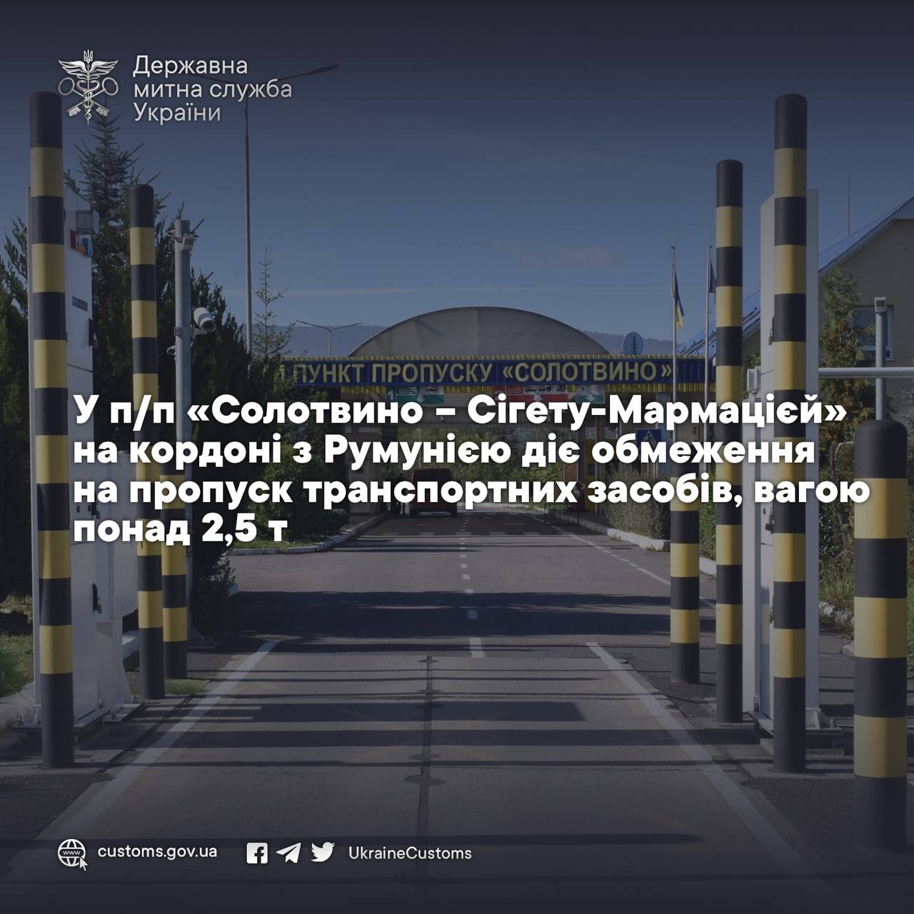 У зв'язку з ремонтом мосту через річку Тиса, який з’єднує Україну та Румунію, у пункті пропуску «Солотвино – Сігету-Мармацієй» румунською стороною введено обмеження на пропуск транспортних засобів, вага яких перевищує 2,5 тонни.