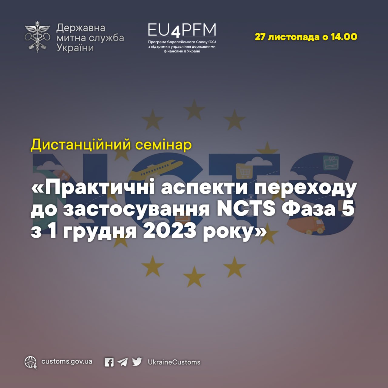 27 листопада о 14:00 Держмитслужба за технічної підтримки Програми ЄС з підтримки управління державними фінансами (EU4PFM) проведе дистанційний семінар «Перехід до застосування NCTS Фаза 5 з 1 грудня 2023 року».