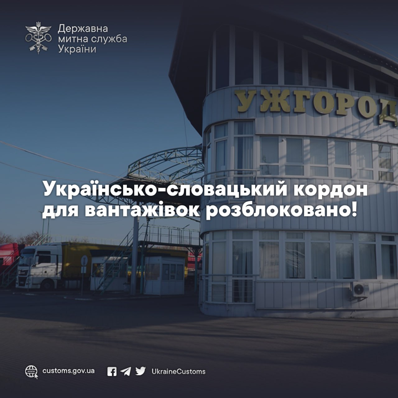 ✅Вночі 22 листопада словацька поліція розблокувала кордон та звільнила проїзд для вантажних транспортних засобів до міжнародного пункту пропуску «Ужгород-Вишнє Нємецьке».