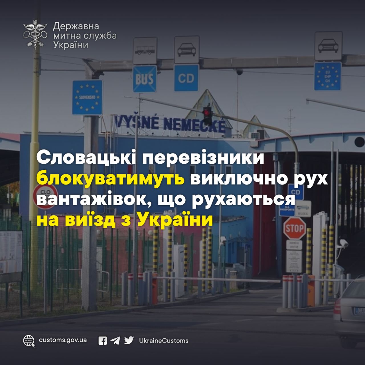 ⛔️Сьогодні вранці у рамках проведеної робочої зустрічі словацька сторона повідомила посадових осіб Закарпатської митниці, що після оголошення продовження акції протесту словацькими перевізниками перед КПП «Вишнє Нємецьке – Ужгород», 11 грудня, починаючи з 15:00 буде заблоковано рух вантажівок з боку України.