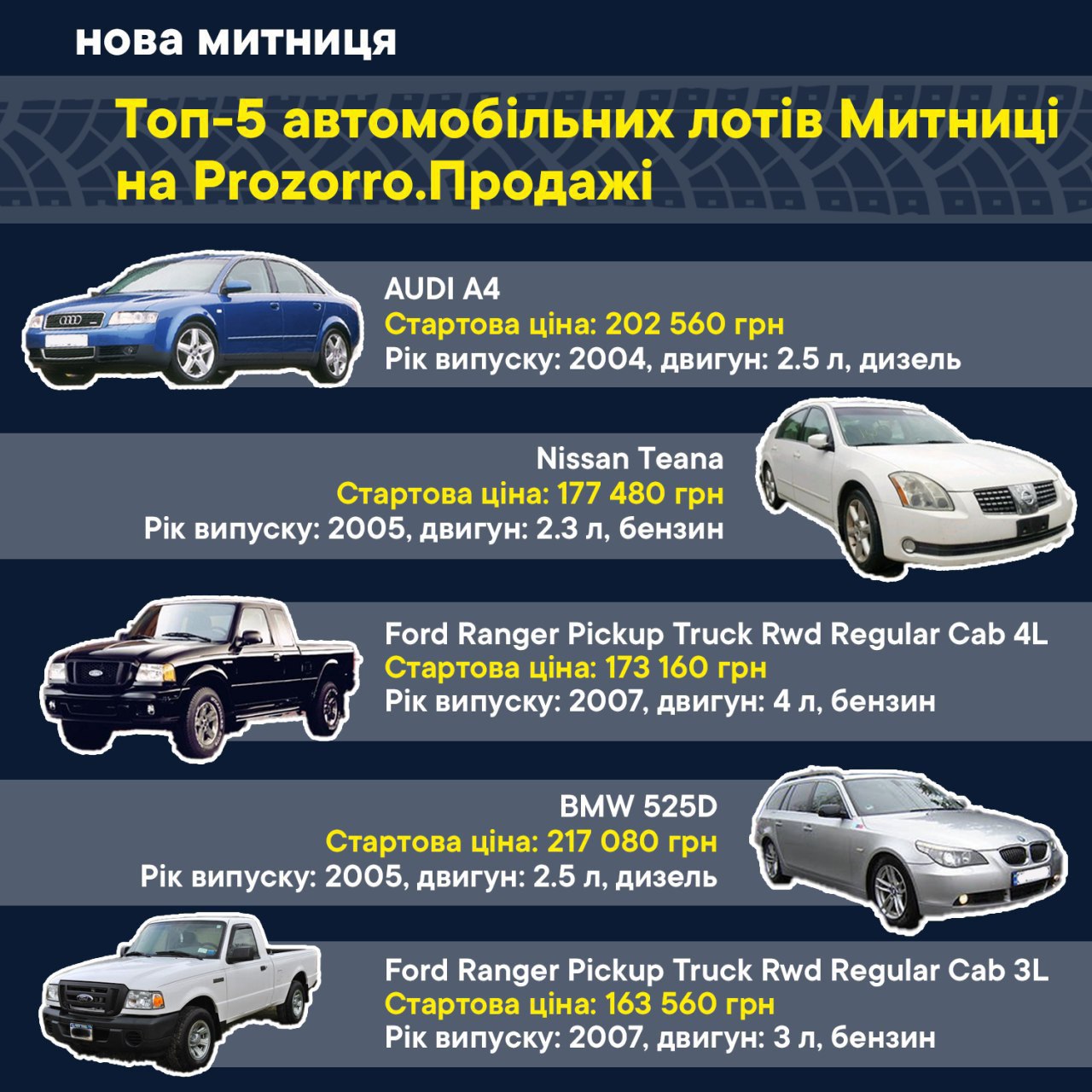 Решту автівок Митниці, виставлених на продаж, можна переглянути за посиланням: https://bit.ly/3bB4IxI
