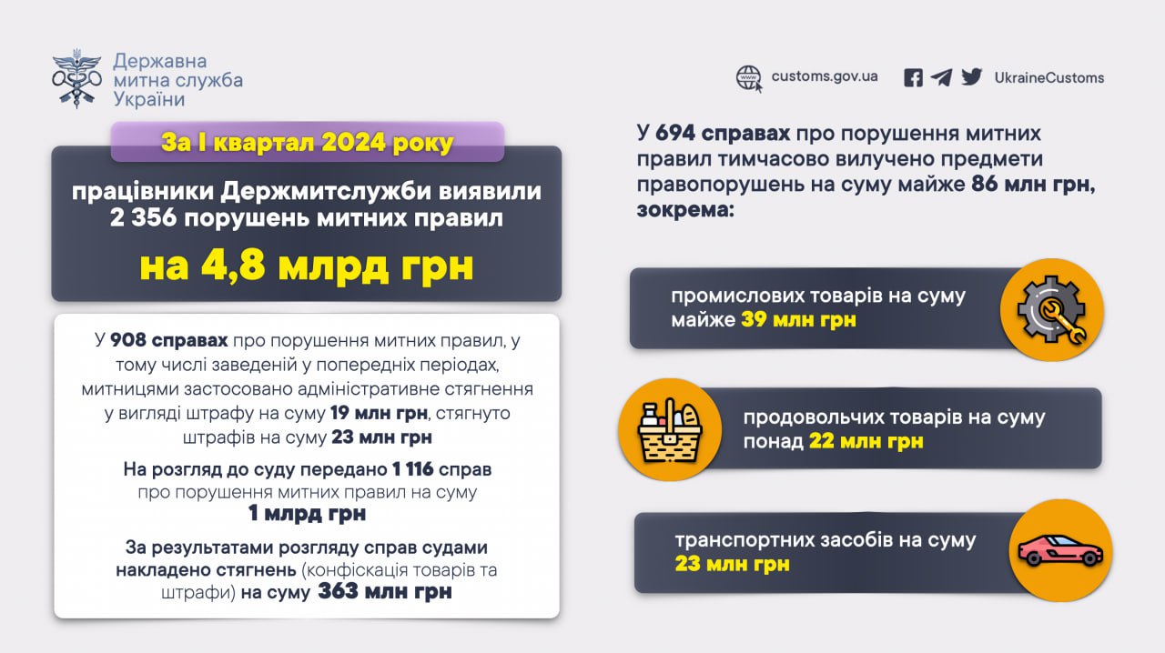 ⛔️За І квартал 2024 року митниці Держмитслужби виявили порушень митних правил на 4,8 млрд грн