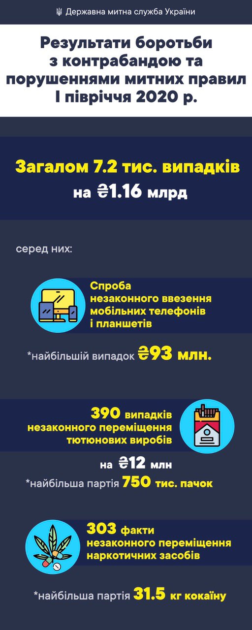 За перші шість місяців поточного року працівники Митниці виявили і припинили 7,2 тис. порушень митних правил, загальна вартість предметів правопорушень становить близько 1,16 млрд грн.