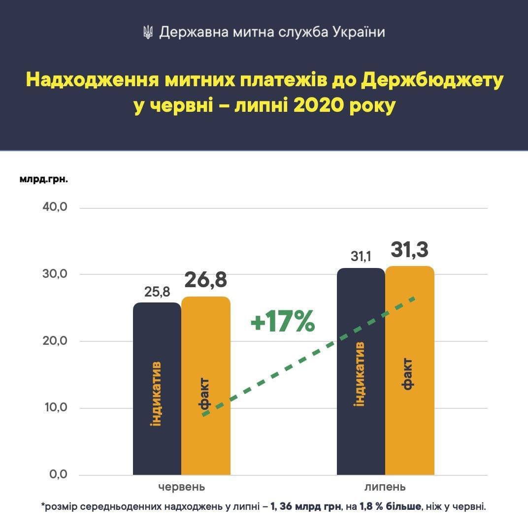 У липні Держмитслужба у повному обсязі забезпечила виконання індикативу, доведеного Міністерством фінансів, і перерахувала до держбюджету 31,3 млрд грн. Це на 4,6 млрд грн (на 17,0 %) більше, ніж у червні поточного року.