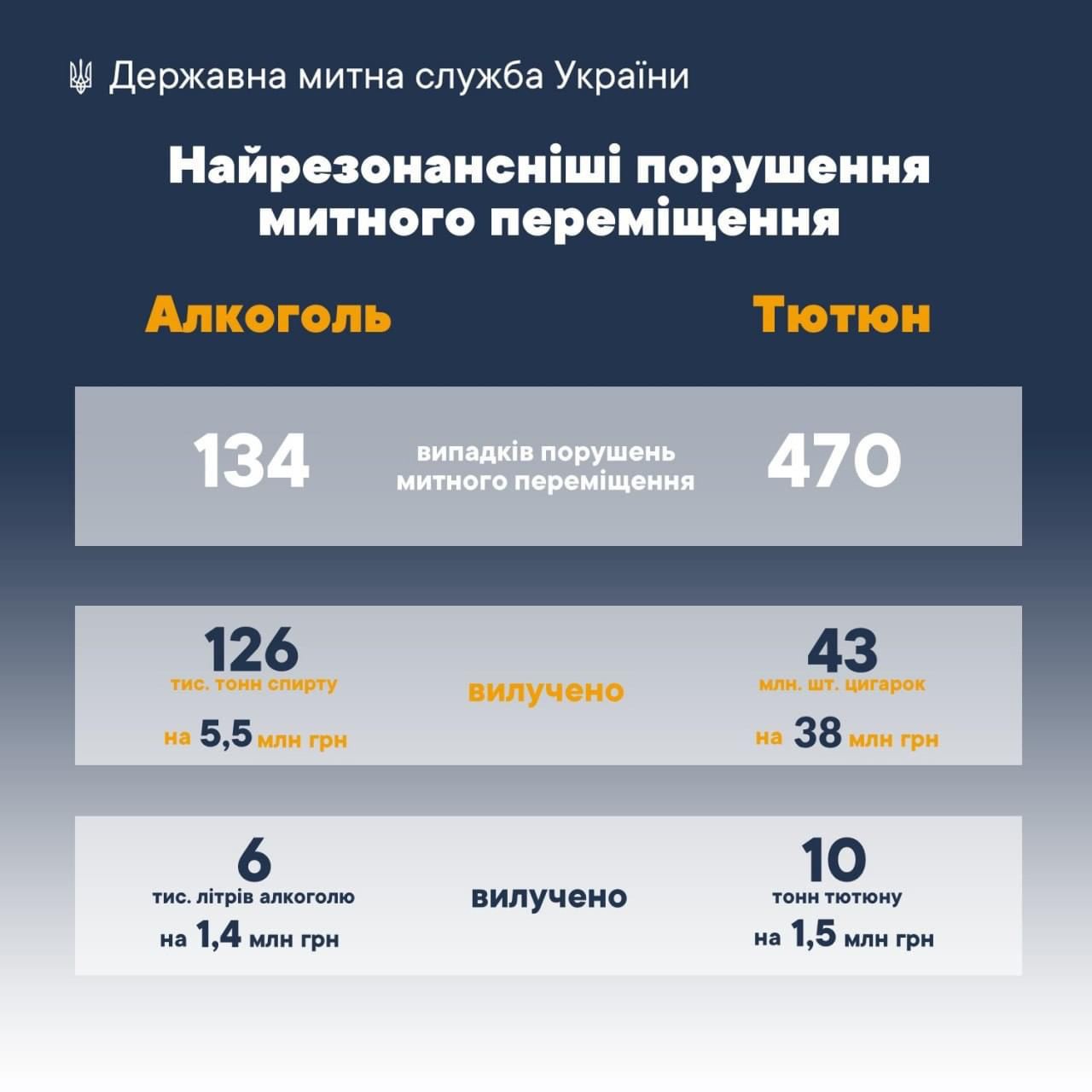 Також упродовж січня – серпня 2020 року виявлено 134 випадки порушень митних правил при переміщенні спирту та алкогольних напоїв. Загалом вилучено понад 132 тис. л спирту та алкогольних виробів на загальну суму майже 7 млн. грн. (126 тис. л спирту на суму 5,5 млн. грн і 6 тис. л алкогольних напоїв на суму понад 1,4 млн. грн).