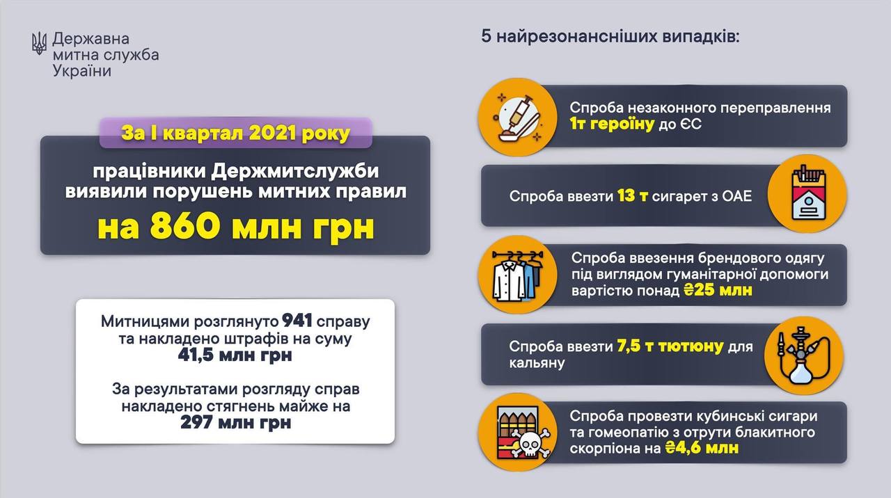 ⚡ За І квартал 2021 року працівники Держмитслужби виявили порушень митних правил майже на 860 млн грн