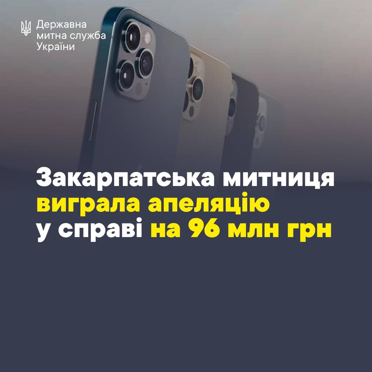 16 квітня Закарпатська митниця виграла справу в Закарпатському апеляційному суді щодо незаконного переміщення товарів техніки “APPLE”, “Samsung” та інші. Сума штрафу склала ‼96 млн грн з конфіскацією вилучених митницею товарів.