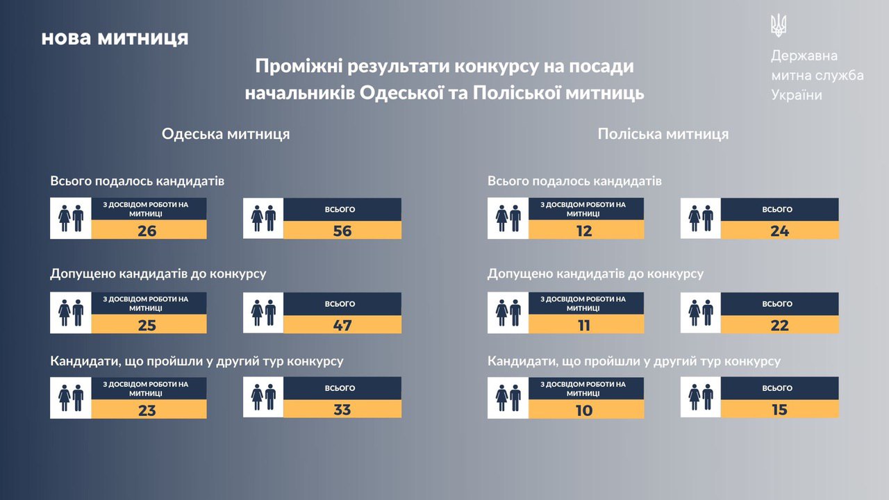 Залишилось 33 претенденти на Одеську митницю (подавалось 56) та 15 на Поліську митницю (подавалось 24).