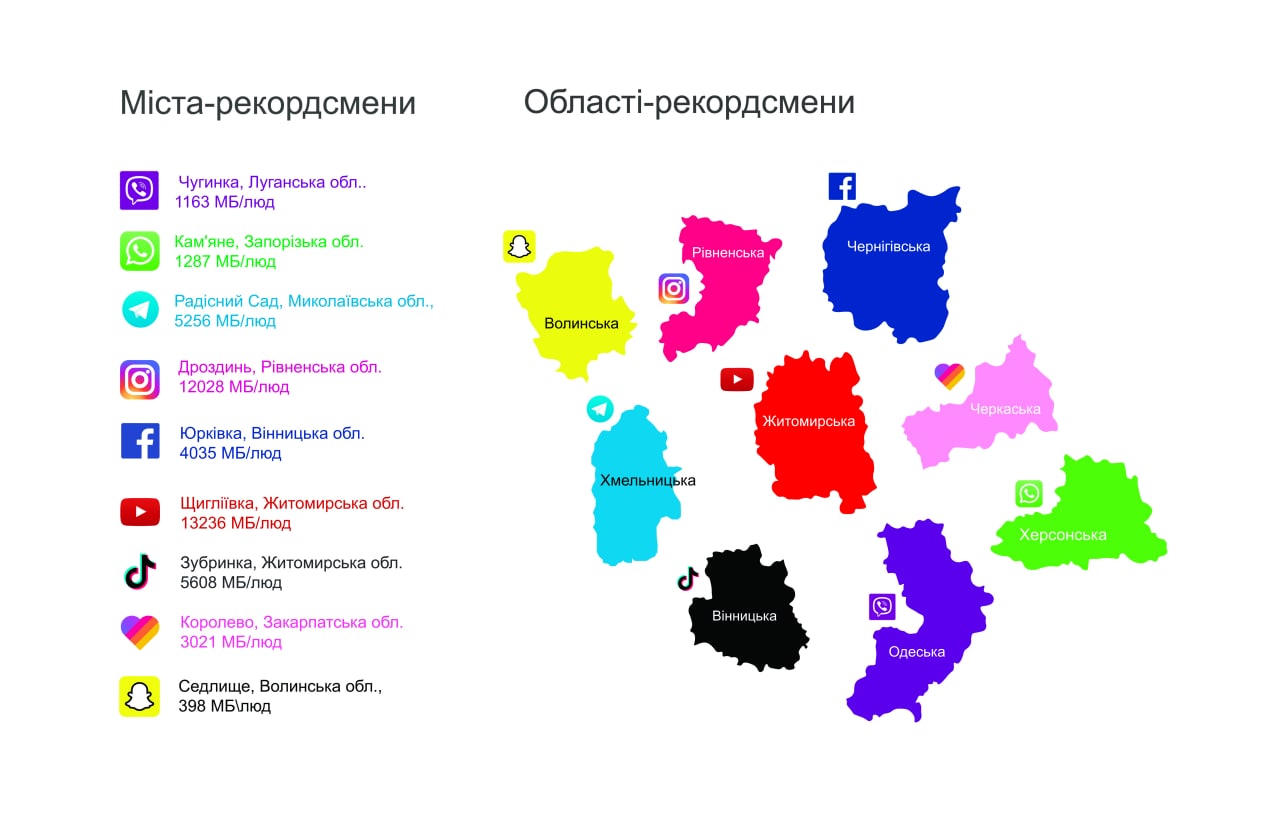 Цього року ми вирішили повторити кольоровий рейтинг областей і міст України – за кольорами значків найбільш популярних (за трафіком) в цих регіонах месенджерів та соцмереж. Є невеличкі зміни у порівнянні з минулорічним рейтингом:
