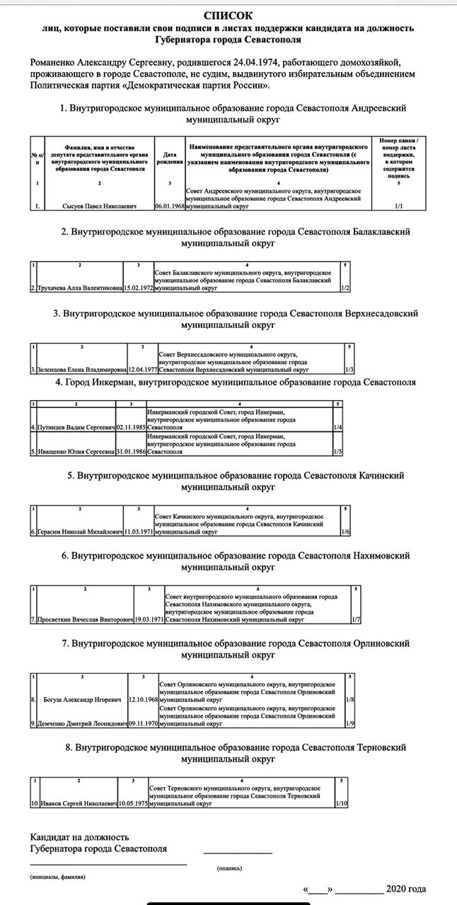 Кандидат в губернаторы города Севастополя от неизвестной в городе «Демократической партии России» без узнаваемости Александра Романенко без всяких проблем собрала муниципальных фильтр-необходимый минимум 9 подписей в 8 муниципалитетах. За нее подписалось 10 депутатов. Каким образом собирался фильтр на сегодняшний день кандидат публично не комментирует. Кто же все - таки поставил из муниципальных депутатов Севастополя свои подписи в поддержку кандидата-«ноунейма» в городской политике?