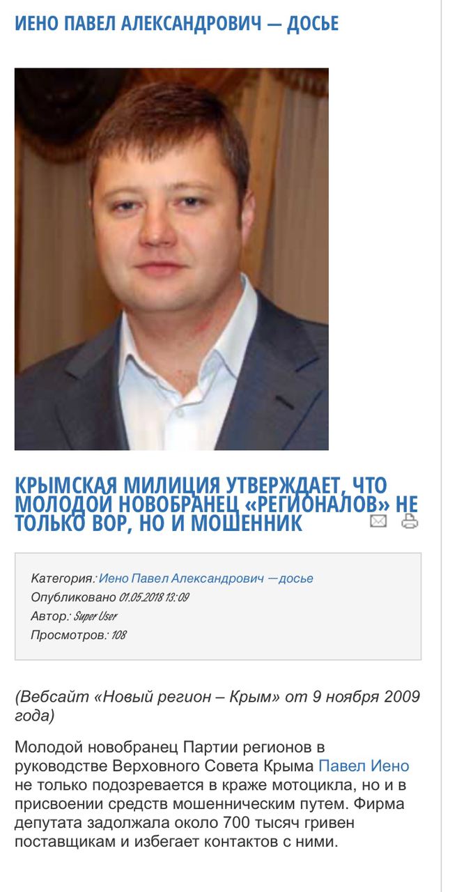 Ещё до этого фамилия Иено упоминалась в рамках расследования уголовных дел. В октябре 2009 года начальник крымской милиции Геннадий Москаль заявил о том, что Павел Иено в 2008 году украл у него мотоцикл «Honda CBR-1000 RR» стоимостью 5 тыс. долларов и потребовал возбудить уголовное дело. Иено в ответ заявил о политическом заказе.