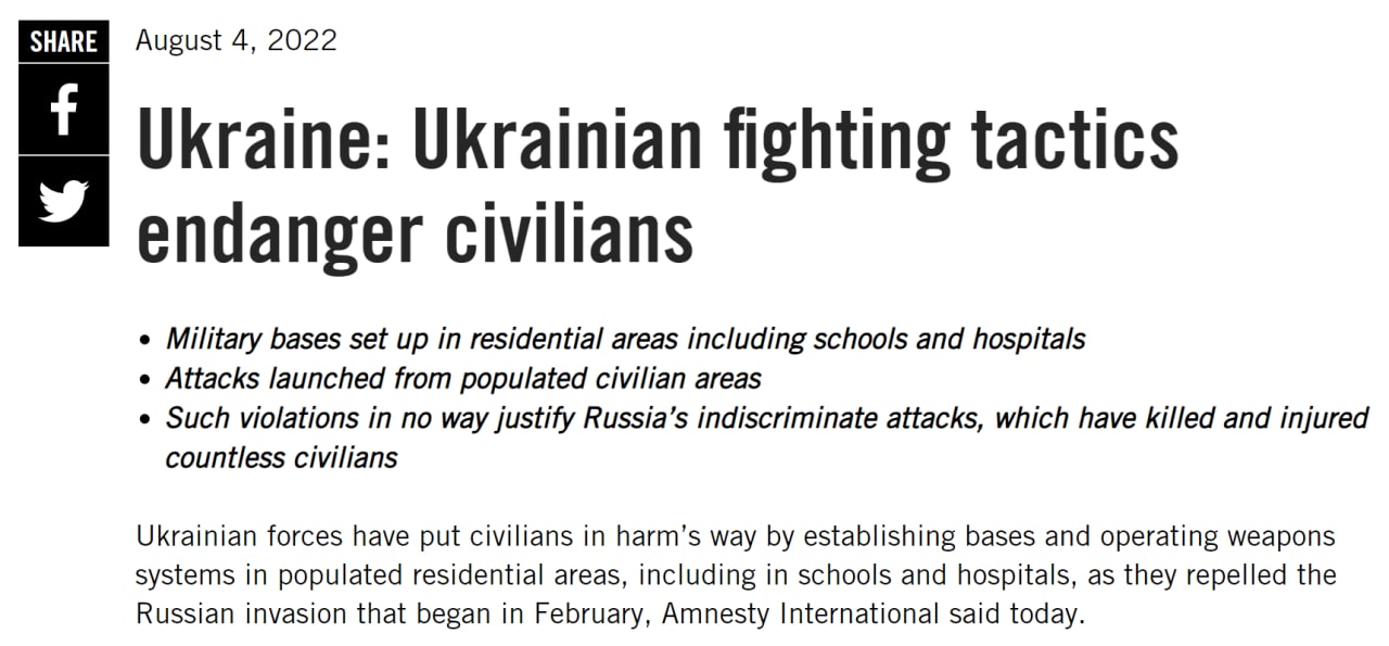 «Нахождение в оборонительной позиции не освобождает украинских военных от соблюдения международного гуманитарного права. Украинское правительство должно немедленно обеспечить размещение своих сил вдали от населенных пунктов или эвакуировать гражданское население из районов, где действуют военные»,