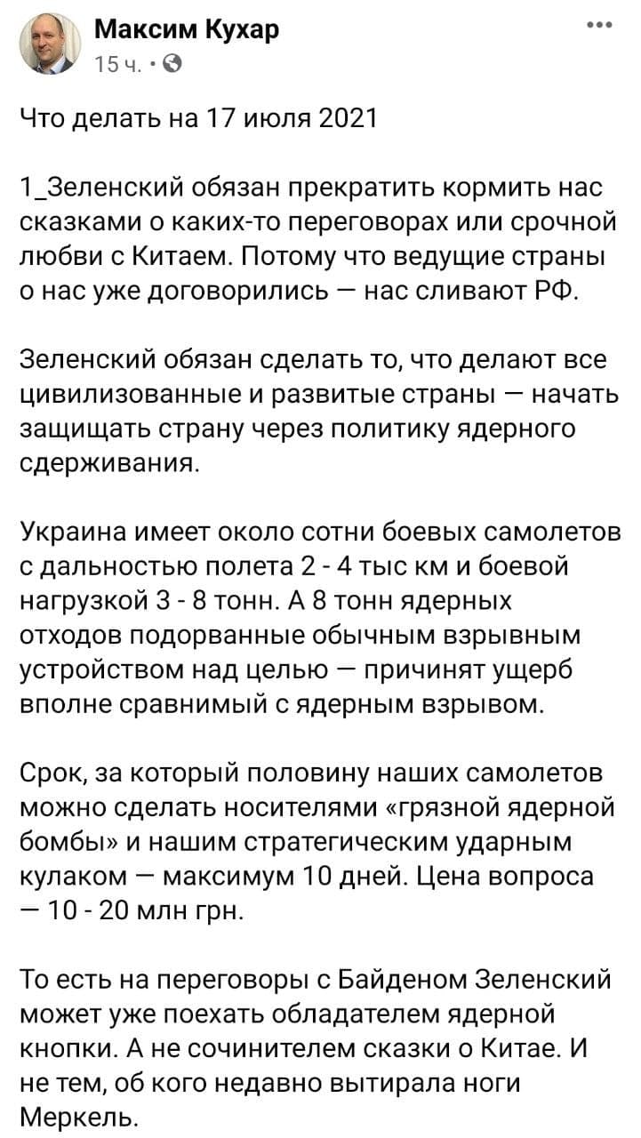 И уж тем более мрачными для Украины будут последствия эту самую грязную бомбу применить. Сбив самолёт с грязной бомбой на борту хоть над Донбассом, хоть (и тем более) на самой территории России, Кремль получит волшебный карт-бланш на любые действия в отношении Киева. Потому что в глазах всего мира даже российские танки на Хрещатике не являются избыточной мерой борьбы с режимом, способным изготавливать и применять "грязные бомбы".