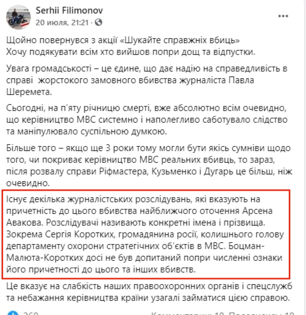 Причем, с явным акцентом на то, что к убийству причастны националистические группировки. Которые связаны с Арсеном Аваковым и Сергеем «Боцманом» Коротких: