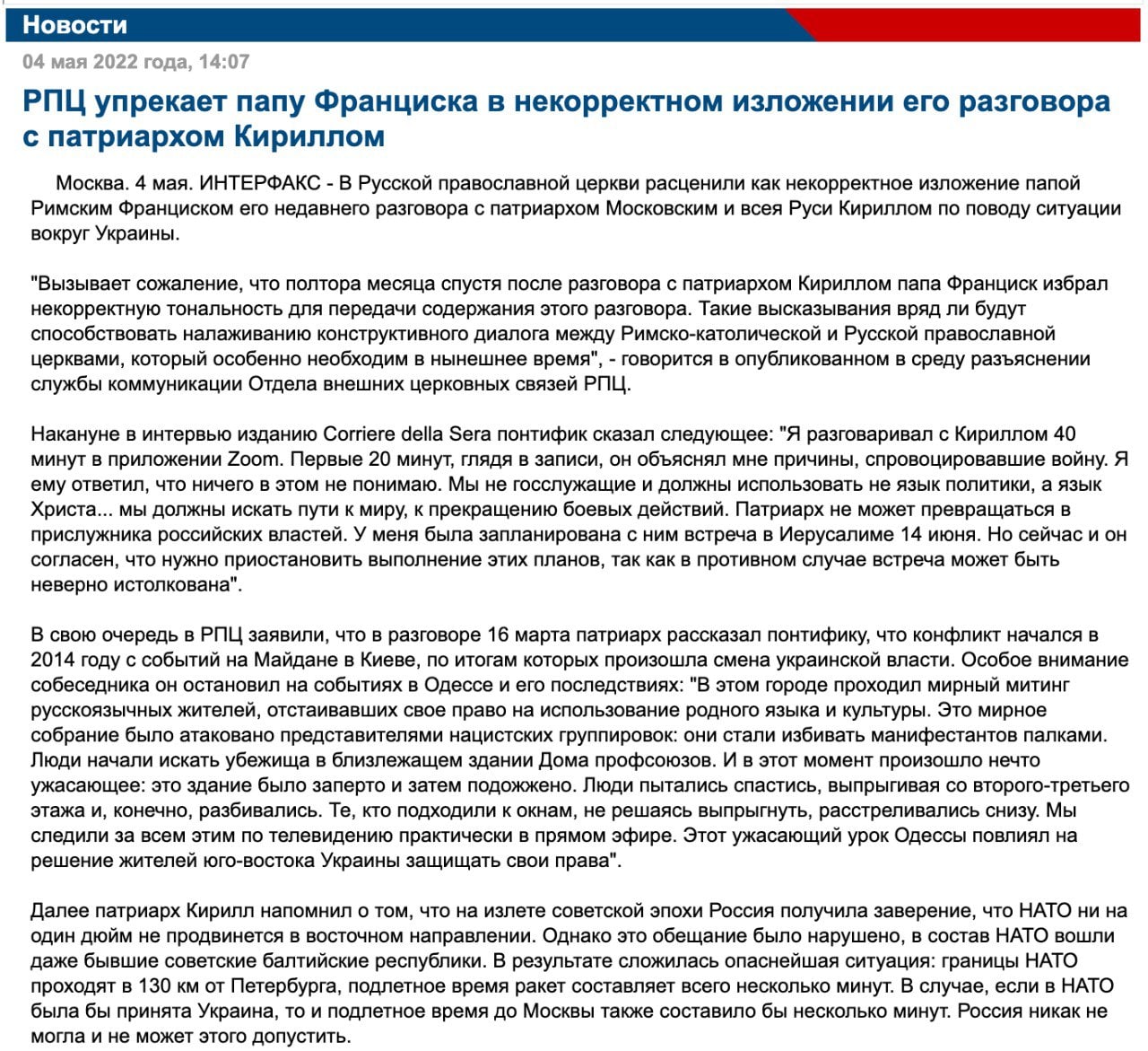 ❗️ В РПЦ назвали некорректным изложение Папой Римским Франциском его разговора с патриархом Кириллом.