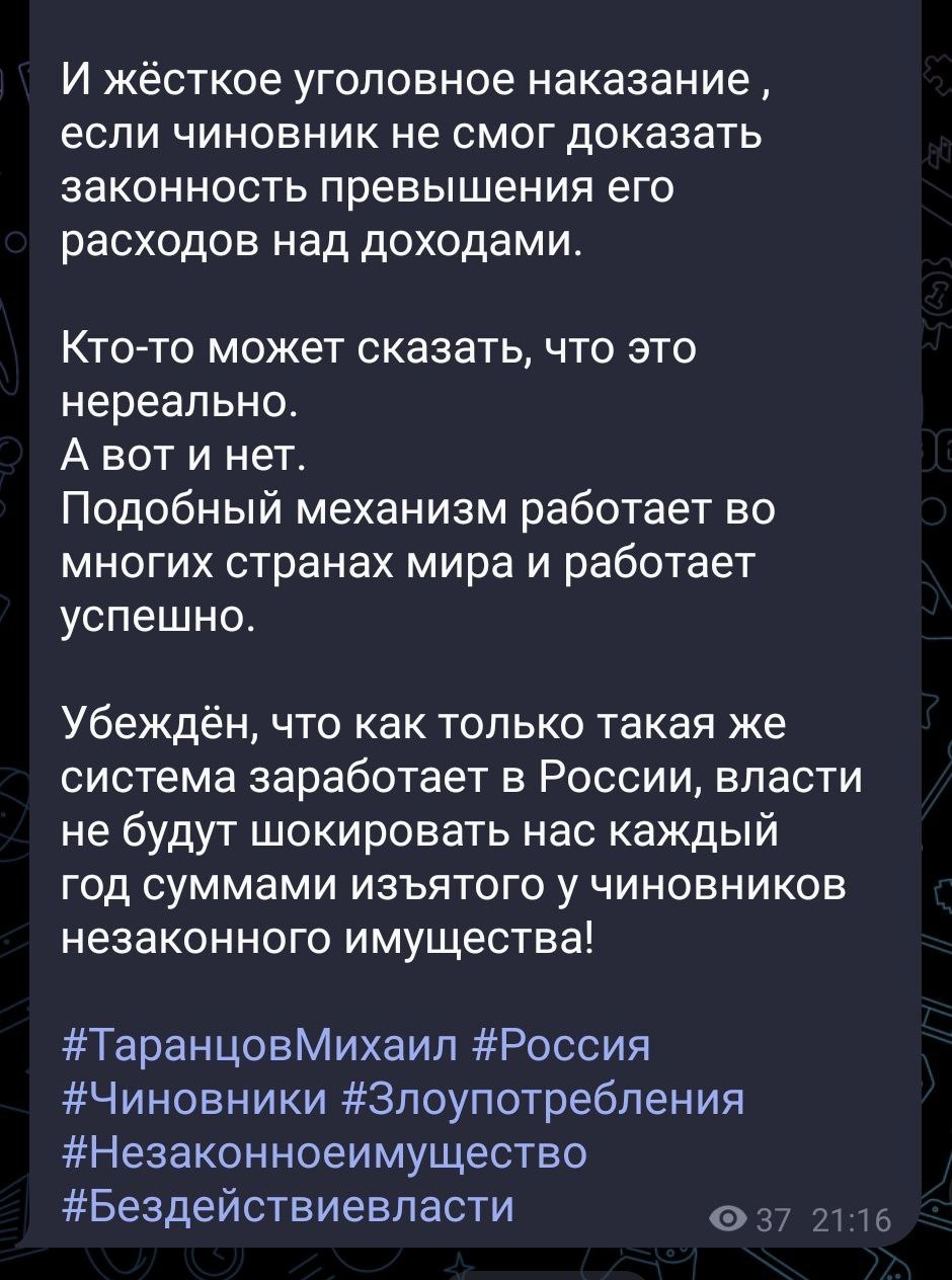 Российских коррупционеров лишили незаконного имущества на 130 млрд рублей, нужно заставить чиновников отчитываться о своих расходах, за незаконное превышение расходов над доходами должно быть уголовное наказание.