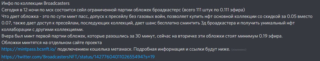➕ В нашем закрытом чате мы давали инфу о сейле минтпассов проекта Broadcasters, который даёт множество интересных плюшек, в том числе ранний доступ к минтингу NFT токенов, который к слову, идёт прямо сейчас, а основной сейл самого проекта начнётся примерно через пару часов.