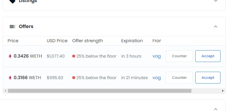 С недавнего времени #OpenSea выгрузили небольшие обновления самой ленты в NFT-коллекциях, а помимо всего прочего добавили очень удобный инструмент аналитики по офферам: теперь вы можете увидеть в процентных соотношениях, насколько предложенная сумма больше или меньше цены входа в проект. Очень удобная штука, чтобы не теряя времени понять - нужно ли вам принимать данный оффер или нет.