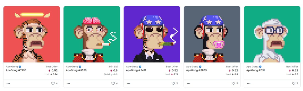 ➕ Ape Gang - это генеративная коллекция пиксельных обезьян на 10,000 NFTs. Была создана ещё в середине июля и какое-то время торговалась на 0.03eth (95$). Сейчас они уникальны своим мощым коммюнити, которое максимально активно развивают и поддерживают создатели проекта.