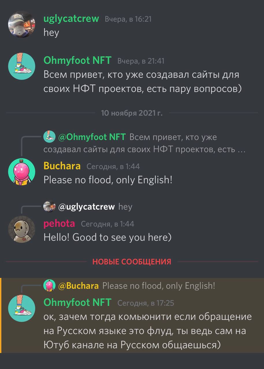 Я не раз упоминал в своих видео о важности использования английского языка в Твиттере и Дискорде, если вы собираетесь вариться в различных NFT сообществах. Хотите, чтобы вас адекватно воспринимали в межнациональном обществе - будьте добры общаться на английском языке. Хотите быть белой вороной и плыть против течения - будьте готовы к тому, что вас накроет волной бана на различных серверах. Почему? Да просто потому, что вы не уважаете правила того или иного сообщества. Да, формально во многих англоязычных серверах не написано «общайтесь только на английском», но это просто потому, что это у них как само собой разумеющееся и если кто замечал, то русскоязычный флуд там не приветствуется (если кто хочет запариваться над этим создаёт специализированные ру-чаты).