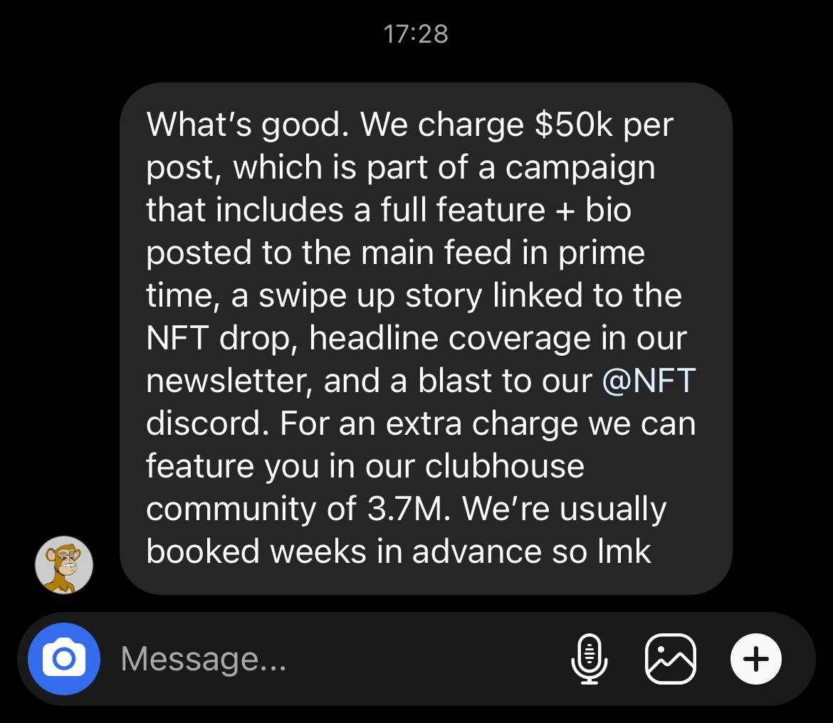 Да, я понимаю, что в крипте и NFT есть возможности нормально на коллекциях заработать и всё такое, но когда откровенно осознаёшь, что тебе нужно отбашлять просто пол сотни тысяч долларов тупо за ОДИН пост в Инстаграме, где не факт что ещё часть аудитории не накручена - тут нужно уже задуматься, а стоит ли вообще такая игра в промо своих свеч?