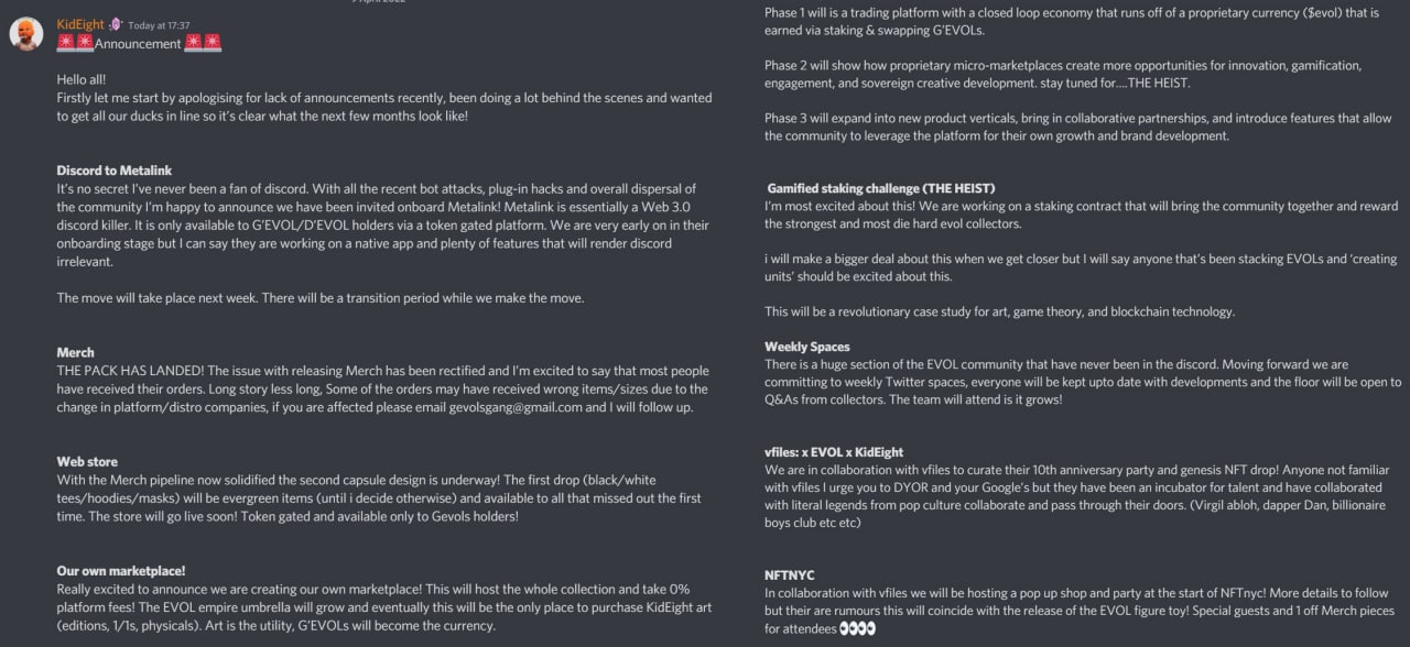 Мы не раз уже писали про коллекцию артиста KidEight под названием G'Evols, запуск которых был максимально ажиотажным, но вот последующая связанная с ней активность была просто ни о чём (скажем открыто - его создатель просто не скрывая тусил, покупал дорогие тачки, да и просто наслаждался жизнью). Но в своём Дискорде он извинился за долгое отсутствие в нём и с ходу зарядил ряд предстоящих мероприятий, которые будут связаны с коллекцией.
