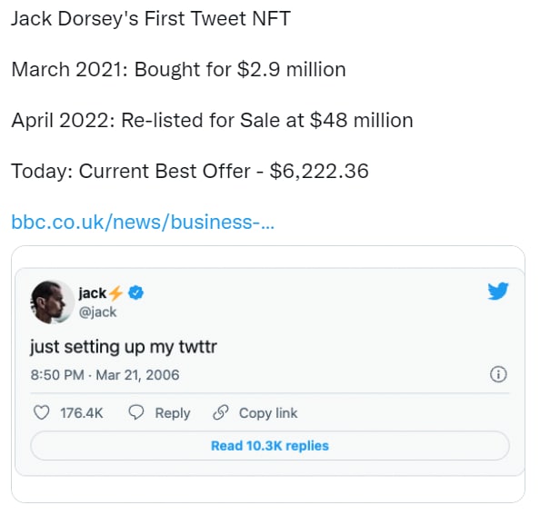 🌚 Фейл года: покупатель прошлогоднего твита со-основателя Твиттера Джека Дорси в качестве #NFT за $2,9млн+ всё это время холдил данный токен у себя в коллекции, надеясь на золотое правило "Ходл решает", выставил ровно спустя год токен за $50млн+ но вот незадача... Sina Estavi (сам холдер) получил действительно большое количество ставок на свою NFT, но наибольшая из них составляла 6,200$ по курсу в eth (около 0,2% от первоначальной покупной суммы, которую он заплатил за это).