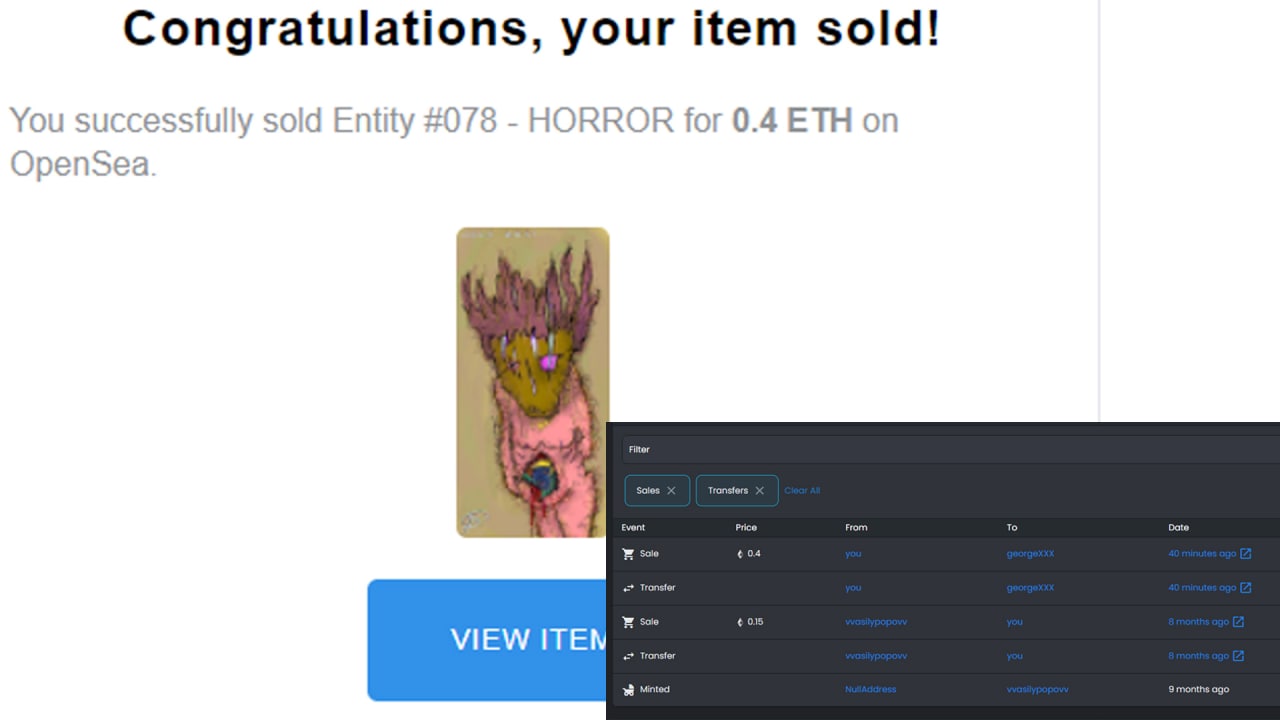 ✅ Ходл решает! На днях у нас выкупили #NFT с коллекции Entities одного художника с интересным своеобразным стилем. Мы о нём как-то уже писали. Токен покупали за 0.15eth 8 месяцев назад, закинули в холд, временно забыли, а за это время художник плавно развивался и раскачивал своё коммюнити. По итогу выкупили наш NFT за 0.4eth (почти 3 икса тоже неплохо!).