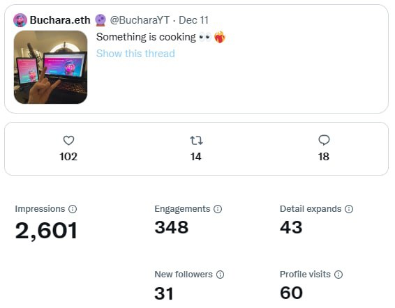 Важным откликом, что сообщество Web3 действительно заинтересовано в том, что я создаю, стала убедительная для меня статистика с одного твита и некоторые фидбеки с вопросами в Директ. Честно говоря, я и не рассчитывал что этот пост вообще заинтересует особо кого, но нет, оказалось что это действительно вызывает позитивную реакцию. И ещё больше её будет, когда мы стартанём поток и совместными усилиями будем развивать профили и творчество каждого, кто влился в сообщество!