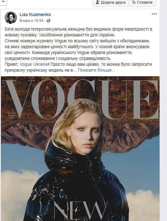 Пані Liza Kuzmenko, я з вами цілком погоджуюсь! Український Vogue дійсно неправильно вчинив, коли запросив на свою обкладинку модель, що навіть не була українкою.