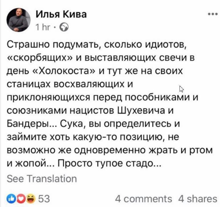 Тут Кива знову обкурився і назвав Бандеру і Шухевича "колоборантами" та "прибічниками Гітлера". Ну, як бачимо, аутизм невиліковний 🤷🏻♂️
