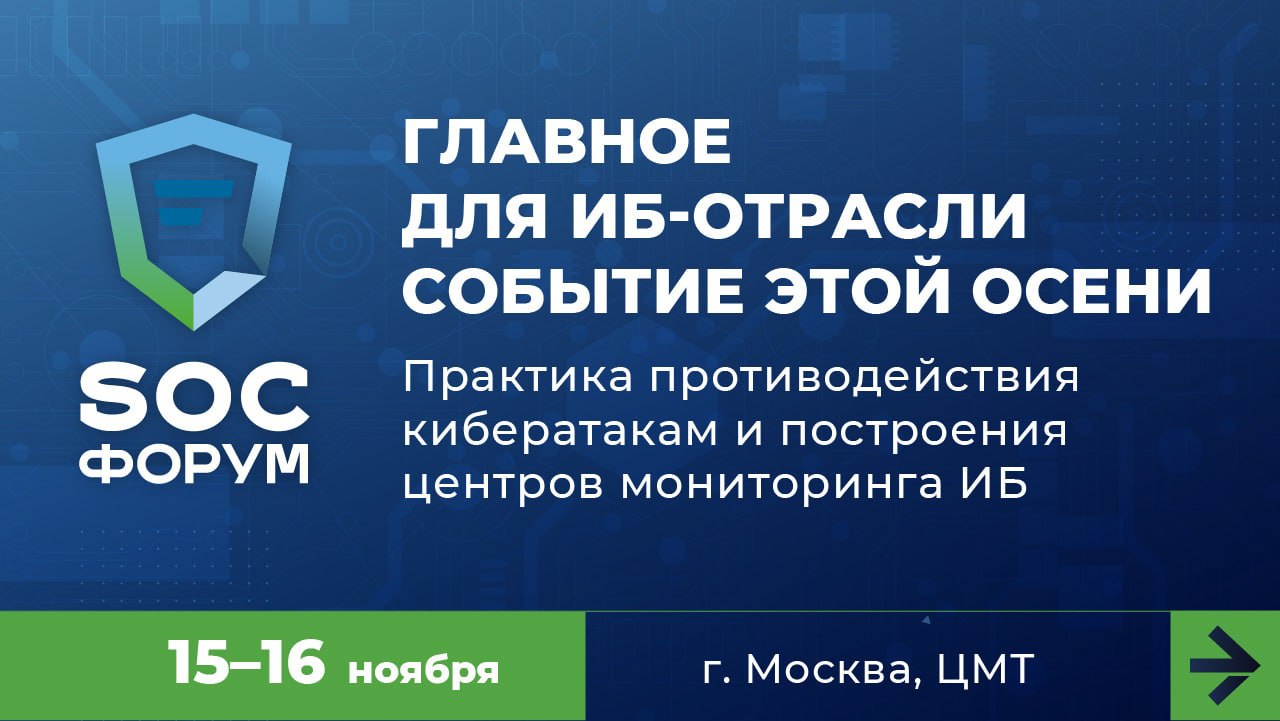 SOC-Форум состоится 15-16 ноября в Москве. В этом году форум соберёт тысячи специалистов, чтобы представить новейшие инструменты мониторинга киберугроз и противодействия компьютерным атакам, обменяться идеями и бесценным опытом.
