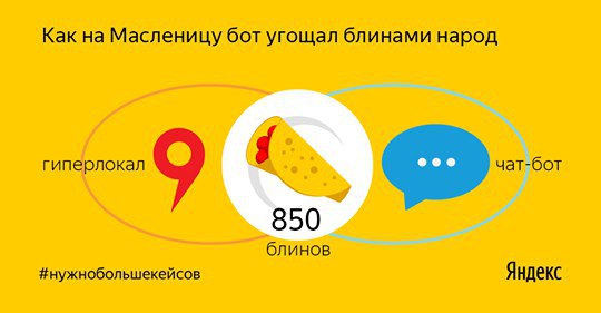 #нужнобольшекейсов про недорогие и эффективные механики активации. Партнёр Яндекса по обучению Антон Астахов и агентство Mello поделились веселым кейсом, как чат-бот в Telegram угощал блинами на Масленицу всех, кто видел гиперлокальную рекламу в Директе. Всего в результате акции было съедено 850 блинов с маслом.