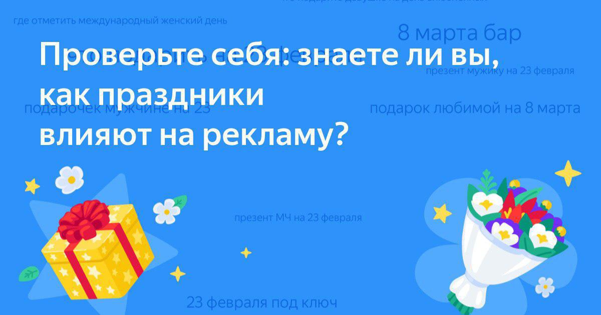Уже успели запустить акции, обновить кампании, подготовиться к скачкам в спросе? Пройдите наш тест и проверьте, знаете ли вы, как ведёт себя аудитория перед 23 февраля и 8 марта и как нужно готовить праздничные кампании.