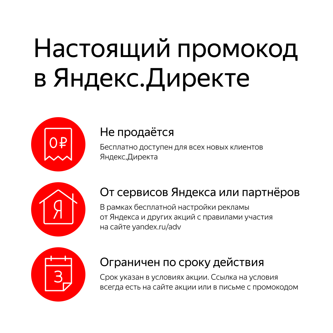 Чтобы не попасться на уловки мошенников, мы советуем использовать только официальные промокоды с ресурсов Яндекса. Они доступны всем новым клиентам на запуск первой рекламной кампании.