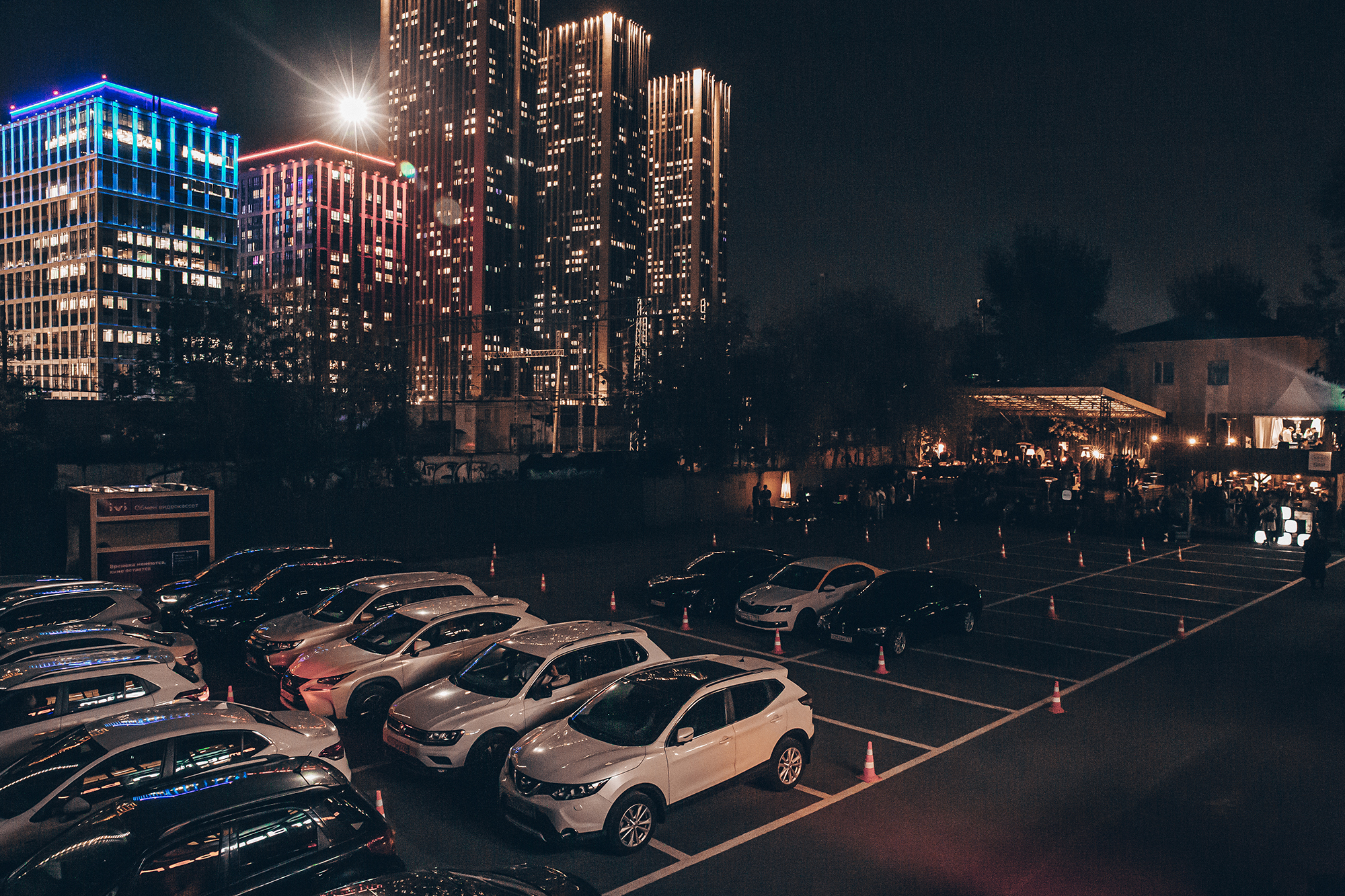 А если вам любопытно, как всё выглядело в оффлайн, вот ссылка на первые фотографии с главного места событий. Мы организовали автокинотеатр и транслировали Среду на большом экране на площадке среди небоскрёбов.