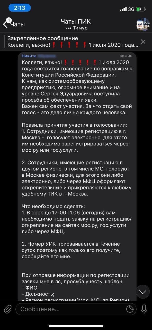 ❗️Сотрудников строительной корпорации ПИК принуждают участвовать в голосовании по поправкам к Конституции. Скриншоты рабочих чатов с такими требованиями предоставили сами сотрудники строительной компании. Менеджеры ПИКа писали коллегам о необходимости зарегистрироваться на портале госуслуг и подать заявку на участие в голосовании.