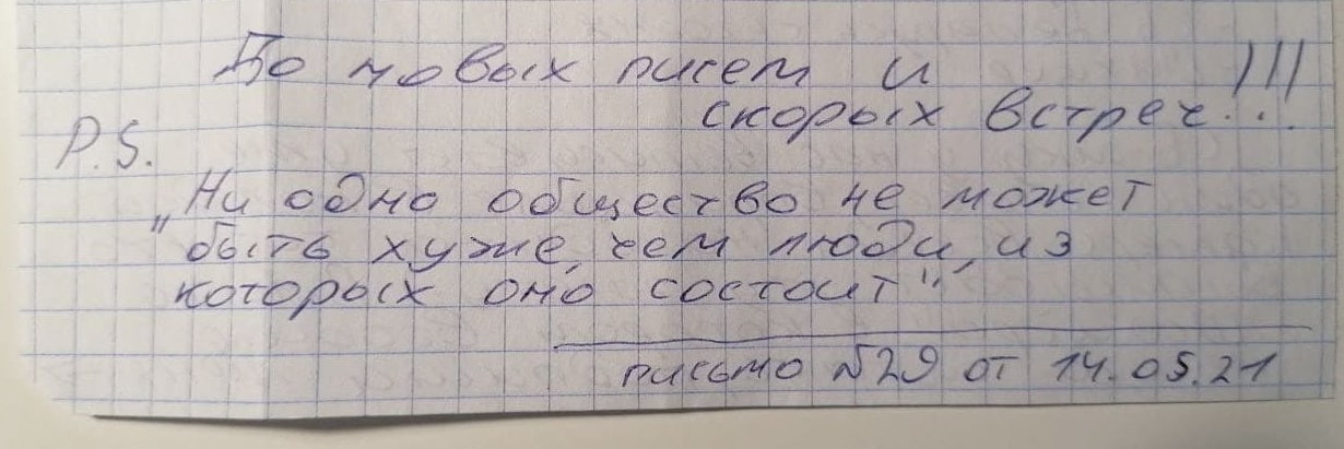В первый день лета делимся хорошими новостями. Наконец-то удалось получить весточку от Сергея Романова. Корреспонденция ему доходит регулярно, правда, только от родителей. В данное время наш товарищ знакомится с результатами экспертиз и, как оказалось, прекрасно рисует!