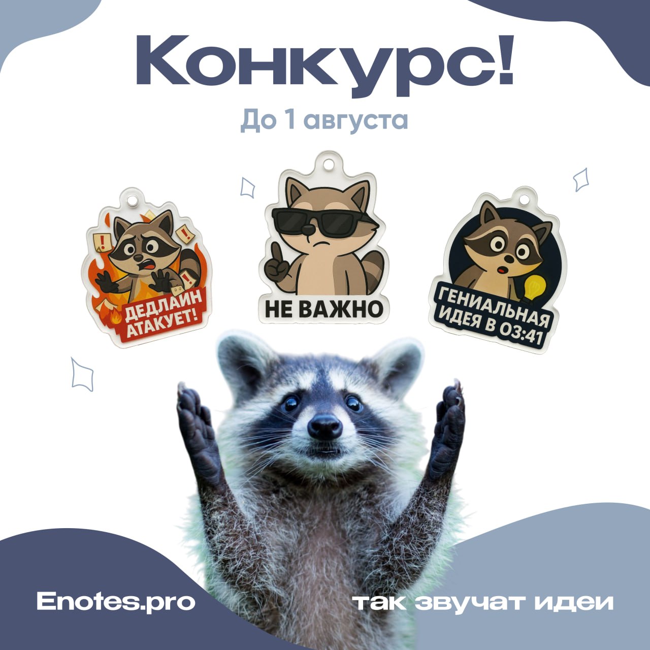 Уже скоро итоги конкурса от Enotes.pro! Не упусти шанс выиграть один из трёх брелков с енотом 🦝