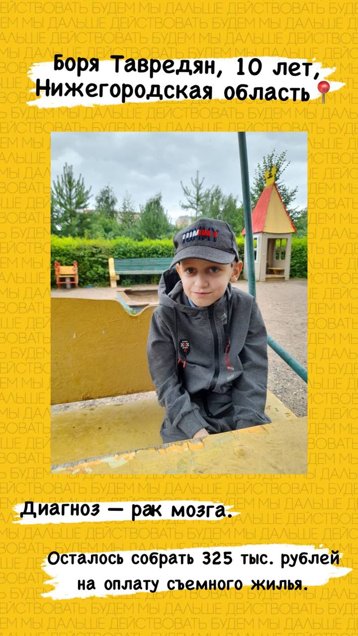 У девятилетнего Бори Тавредяна — рак мозга. Мальчик сильно похудел и ослаб, практически не встаёт с кровати. В Москве он получает должное лечение, но, чтобы его не прерывать, нужно где-то жить. Семья просит помощи в сборе средств на аренду квартиры.