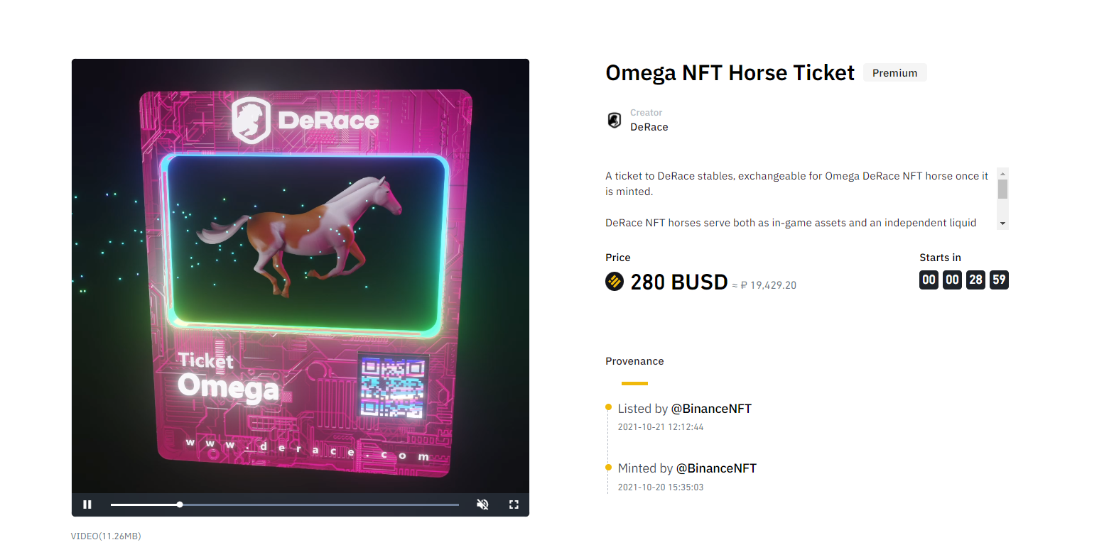 Билет в конюшню DeRace, который можно обменять на лошадь Omega DeRace NFT после чеканки.