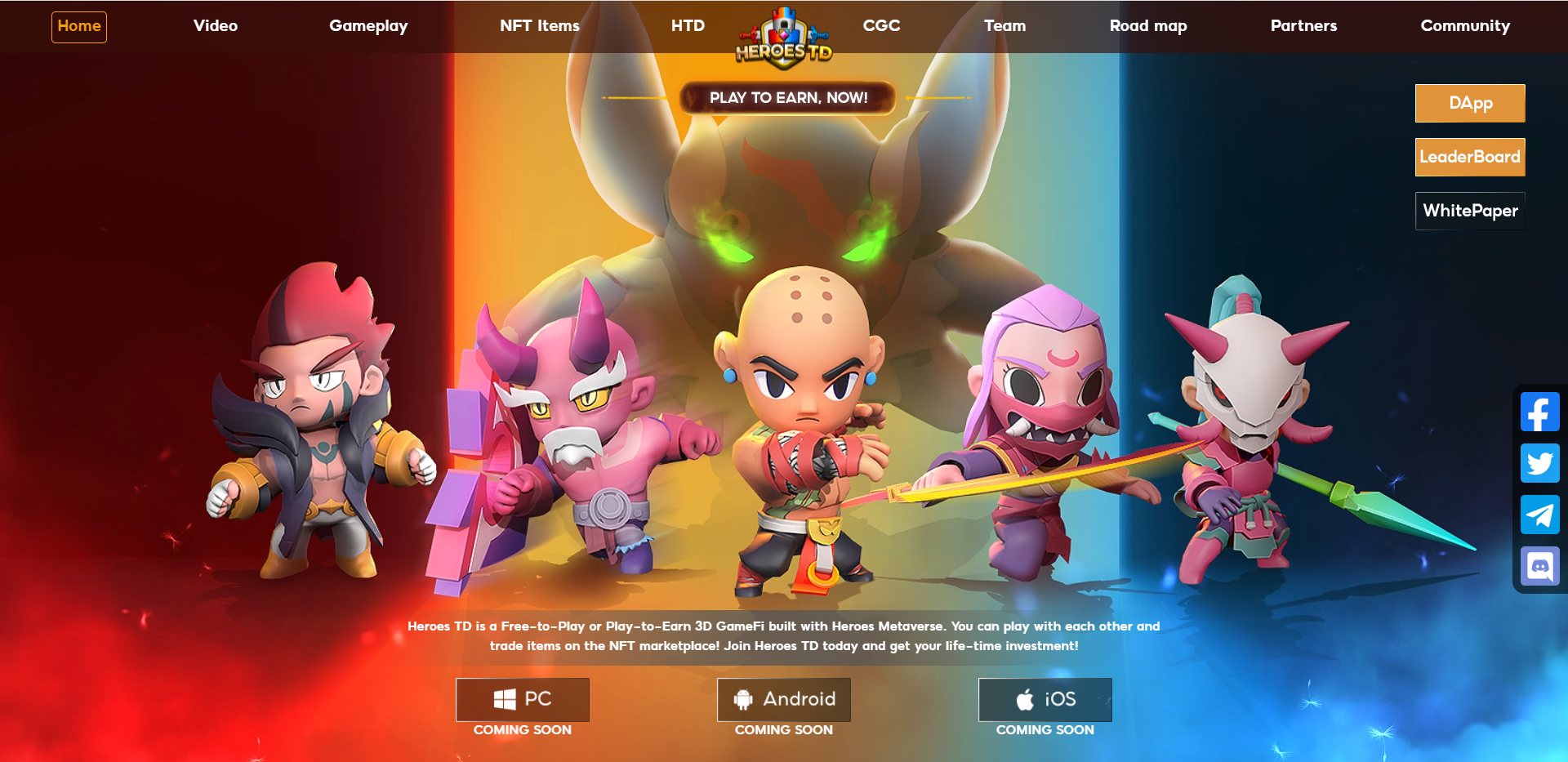 Heroes TD - это 3D GameFi для бесплатной игры или игры с заработком, созданная с помощью Heroes Metaverse. Вы можете играть друг с другом и обмениваться предметами на торговой площадке NFT! Присоединяйтесь к Heroes TD сегодня и получите пожизненное вложение!