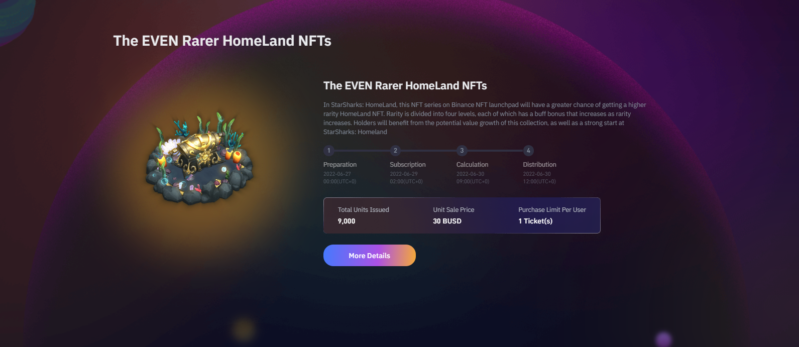 HomeLand у этой серии NFT на стартовой панели Binance NFT будет больше шансов получить NFT HomeLand более высокой редкости. Редкость разделена на четыре уровня, каждый из которых имеет положительный бонус, который увеличивается по мере увеличения редкости. Владельцы получат выгоду от потенциального роста стоимости этой коллекции, а также сильного старта в StarSharks: Homeland.