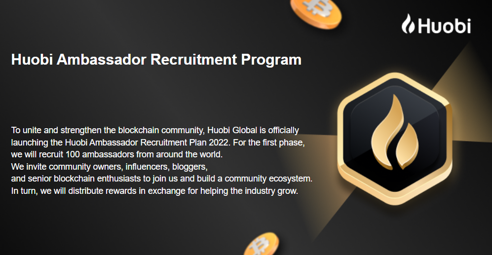 Для программы набора амбассадоров Huobi будет открыто только 100 мест. Так как я попал в нее, могу сказать что у них уже больше 100 человек и продолжают набирать в нее! Попасть было не очень сложно, т.к. я сделал под себя портфолио из моих работ.