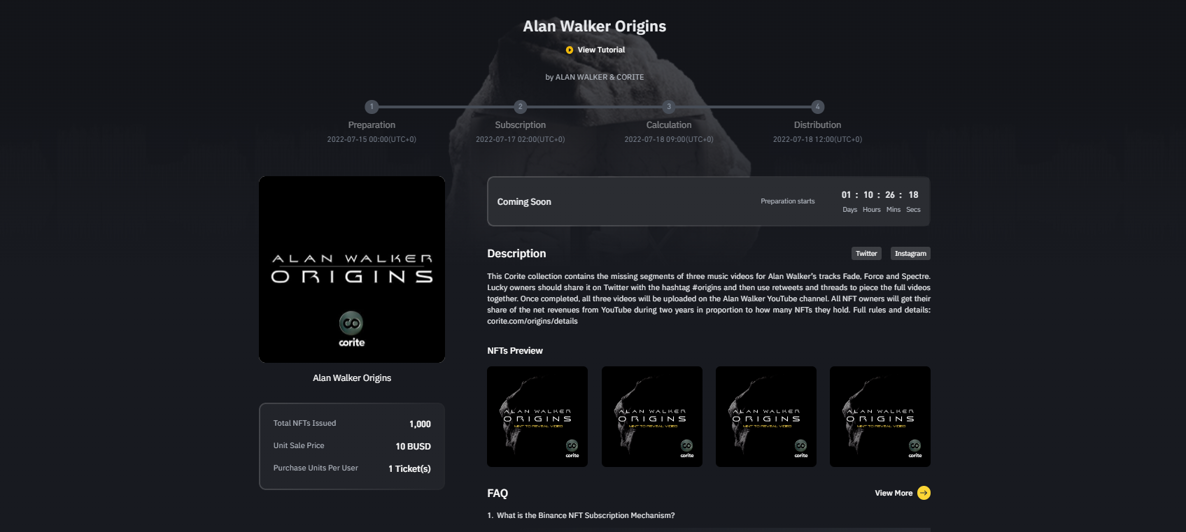 Alan Walker Origins - эта коллекция Corite содержит недостающие фрагменты трех видеоклипов на треки Алана Уокера Fade, Force и Spectre. Счастливые владельцы должны поделиться им в Твиттере с хэштегом #origins, а затем использовать ретвиты и треды, чтобы собрать полные видео воедино. После завершения все три видео будут загружены на канал Алана Уокера на YouTube. Все владельцы NFT получат свою долю чистого дохода от YouTube в течение двух лет пропорционально количеству NFT, которое они держат. Полные правила и подробности: corite.com/origins/details