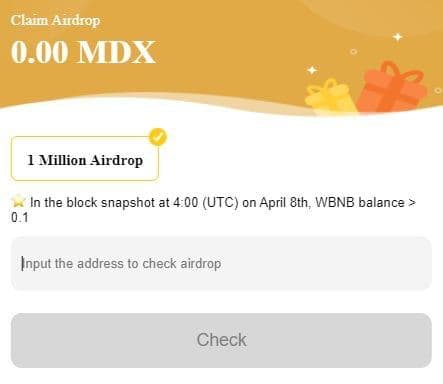 Если по счастливой случайности 8 апреля на балансе вашего BSC-кошелька было на балансе не менее 0.1 WBNB, можете получить аирдроп на 5 MDX (26$) от свапалки MDEX.