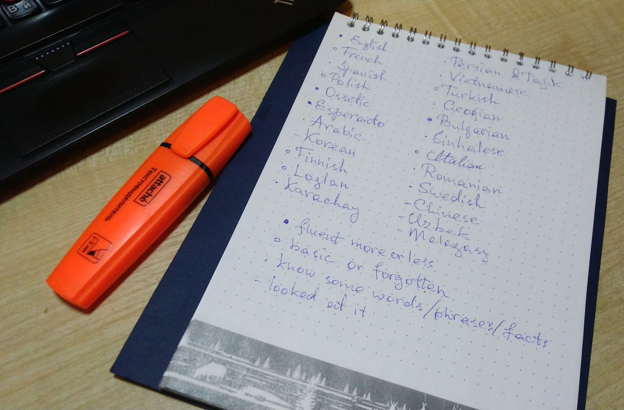И по традиции даю раз в пять лет обещание новых языков не учить :) В прошлый раз после такого — „я бы хотел довести до ума турецкий и болгарский, не забыть осетинский, но не более того“ — взялся за два, персидский и вьетнамский :)